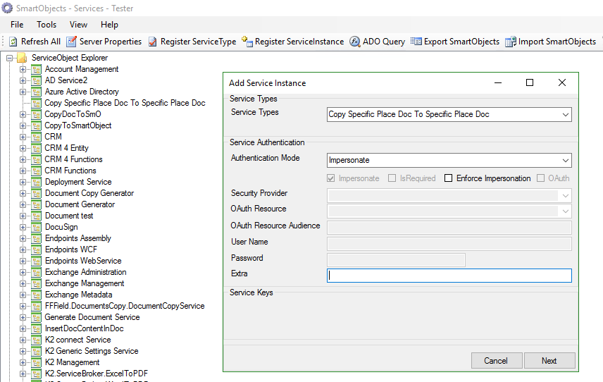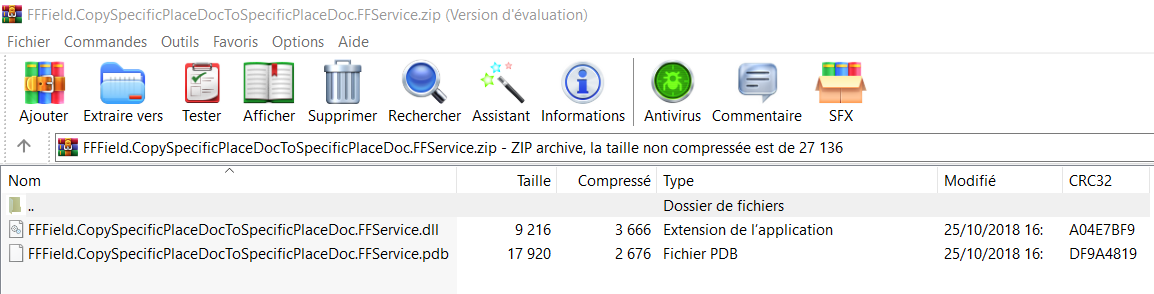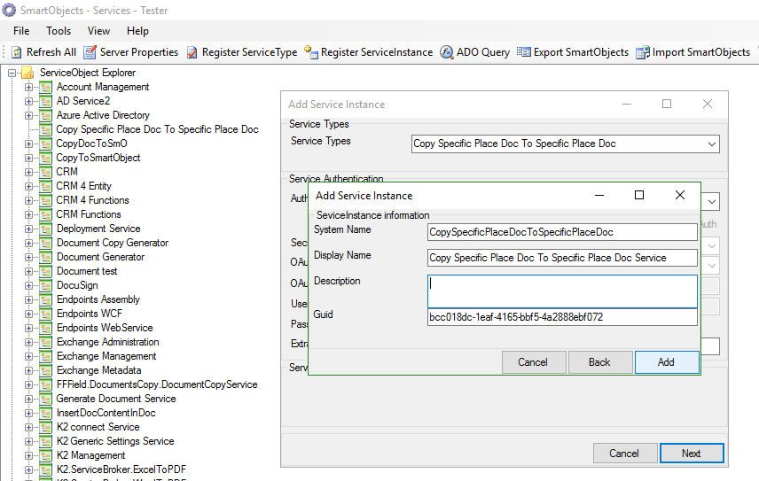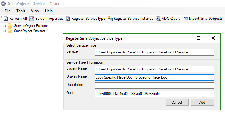 - Sur la fenêtre qui s’ouvre, cliquez sur le Register ServiceType. Dans la fenêtre qui s’ouvre, sélectionnez le nom du service à installer, qui est le nom du fichier.dll, dans notre cas FFField.CopySpecificPlaceDocToSpecificPlaceDoc.FFService.