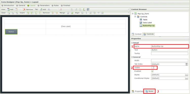 Nommez votre bouton ButtonPop-Up(1), décochez la case visible(2), puis cliquez sur Rules(3) .