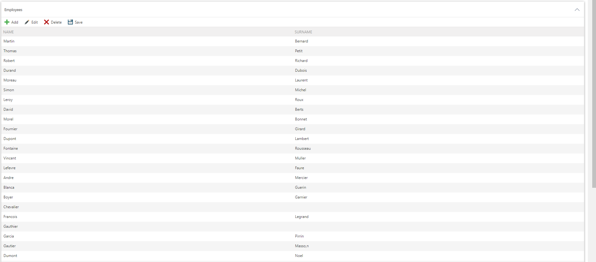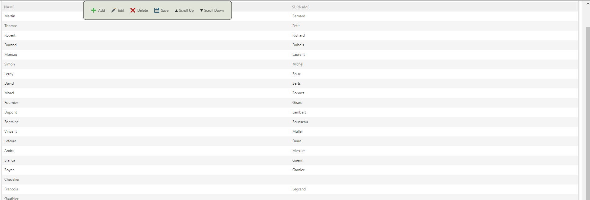 Lorsque vous avez trop d’éléments sur une vue de type liste éditable, si vous vous trouvez en bas de la page, il devient problématique de pouvoir ajouter, modifier ou supprimer un élément car les toolbars « Add », « Edit », « Delete » et « Save » ne sont plus visibles. Vous êtes obligé de revenir en haut de la page pour les voir.