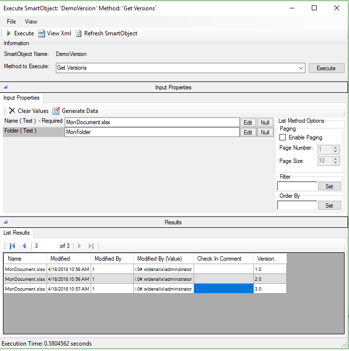K2 nous propose dans ses SmartObjects, de manipuler les versions d’un document via les méthodes Get Version (détail d’une version spécifique d’un document) et Get Versions (lister l’ensemble des versions d’un document) :