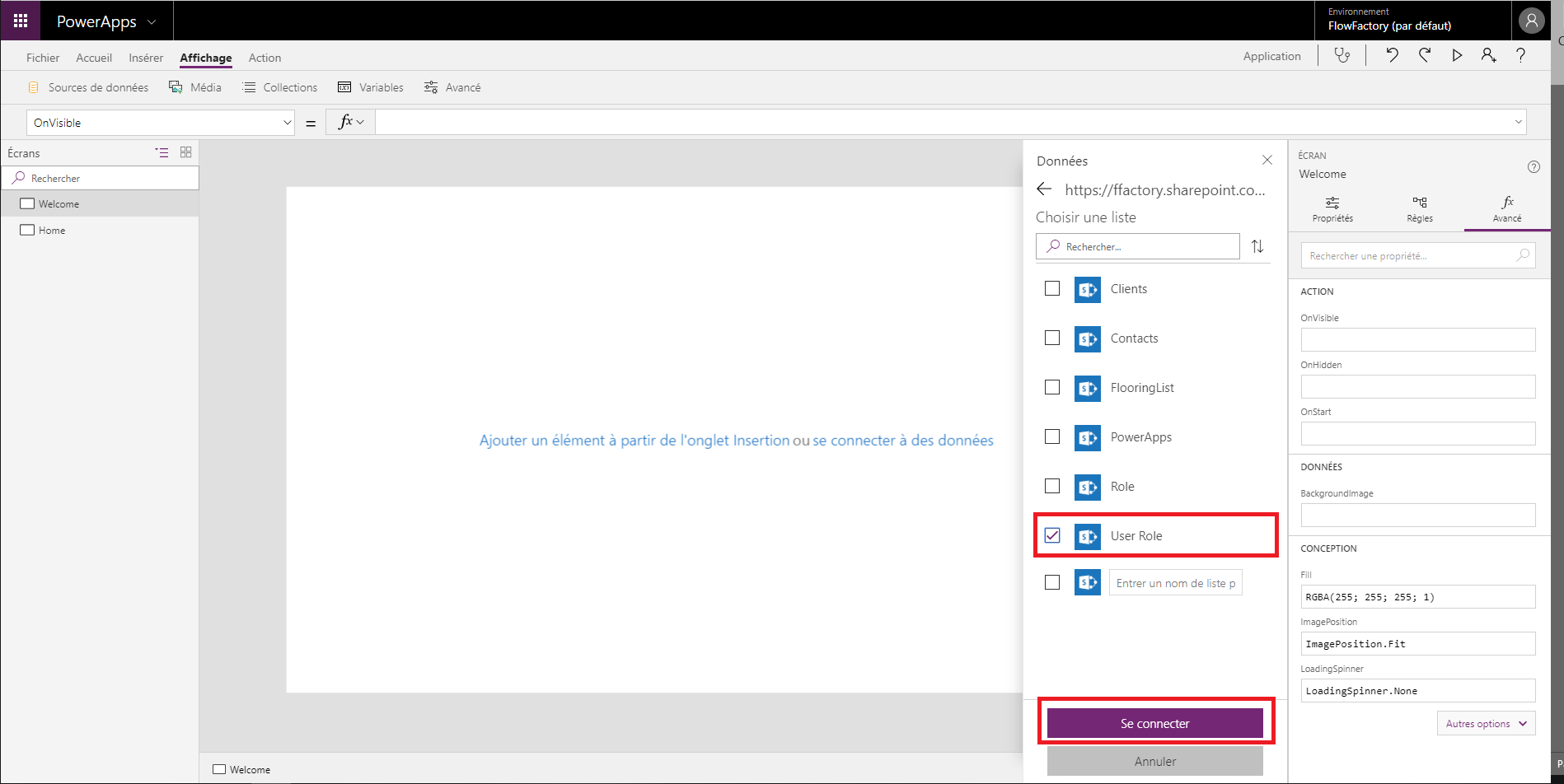 - Welcome : Cette page nous permettra de récupérer les informations sur l’utilisateur connecté puis de faire une requête à notre source de données qui nous renverra un résultat. Ensuite, ce résultat sera stocké dans une variable globale « Résultat ».
