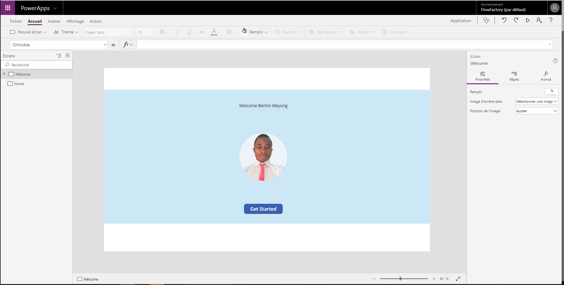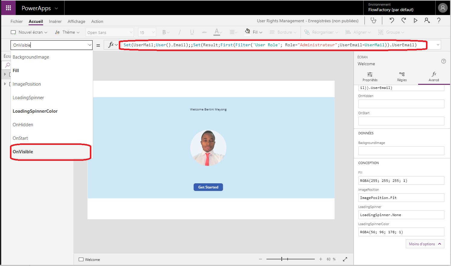 If(!IsBlank(Result);UpdateContext({AdminVisible:true})) : Si la variable Result est vide alors l’utilisateur connecté n’est pas Administrateur sinon, il l’est, logique. Si il est donc Administrateur, alors la variable locale AdminVisible passe à « true », donc l’onglet « Administraion » sera visible. Il faut à présent initialiser AdminVisible à false quand on clique sur le Bouton « Get Started » afin que cet onglet soit caché par défaut.