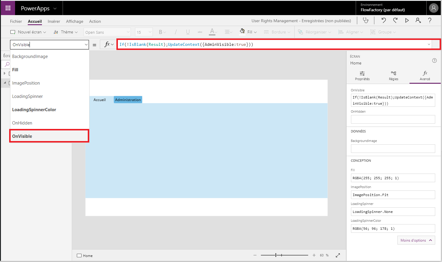 Set(UserMail;User().Email) : La fonction Set crée la variable globale UserMail si elle n’existe pas déjà et la met à jour si elle existe en lui affectant la valeur User().Email (l’Email de la personne connectée).Set(Result;First(Filter('User Role'; Role="Administrateur";UserEmail=UserMail)).UserEmail) : à l’instar de l’instruction précédente, celle-ci obtient dans la liste ‘User Role’, l’Email de la personne connectée associé au rôle « Administrateur », puis stocke cet Email dans la variable globale « Result ».La suite du travail se fera dans l’écran Home. Dans sa propriété avancée « OnVisible » (ici il n’y a plus de « OnStart »). On commence par changer la propriété « OnVisible » de tous les éléments que l’on veut cacher/afficher en fonction des droits. Dans notre cas c’est l’onglet « Administration » dont la propriété « OnVisible » est AdminVisible, une variable locale.