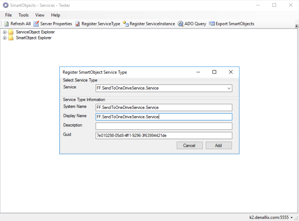 Une fois la DLL copiée, ouvrir l’utilitaire SmartObject Service Tester, puis cliquer sur le bouton « Register ServiceType »